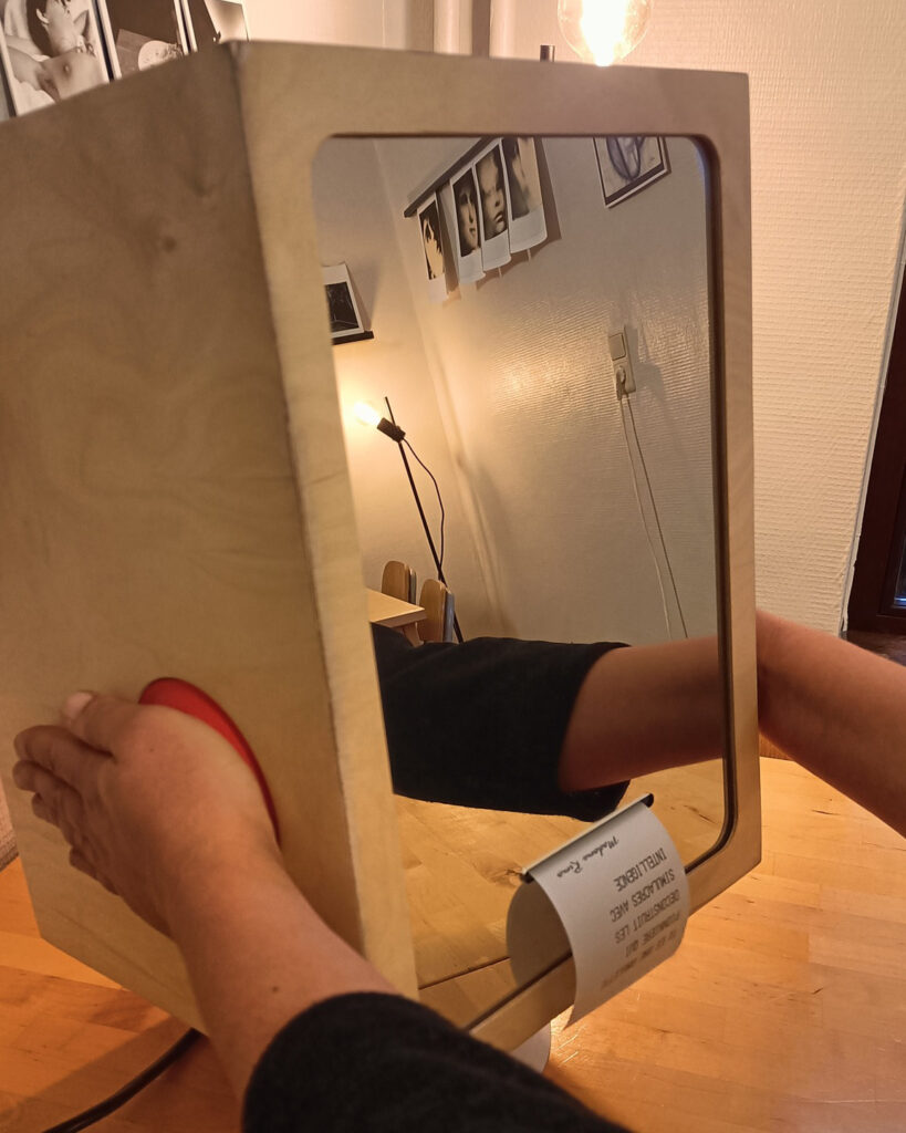Aujourd’hui, l’œuvre a évolué en une installation interactive : grâce à un dispositif mêlant miroir, capteurs et algorithmes, Madame Rima génère et imprime en direct des poèmes personnalisés pour chaque visiteur·euse, sous forme de petits tickets à emporter.